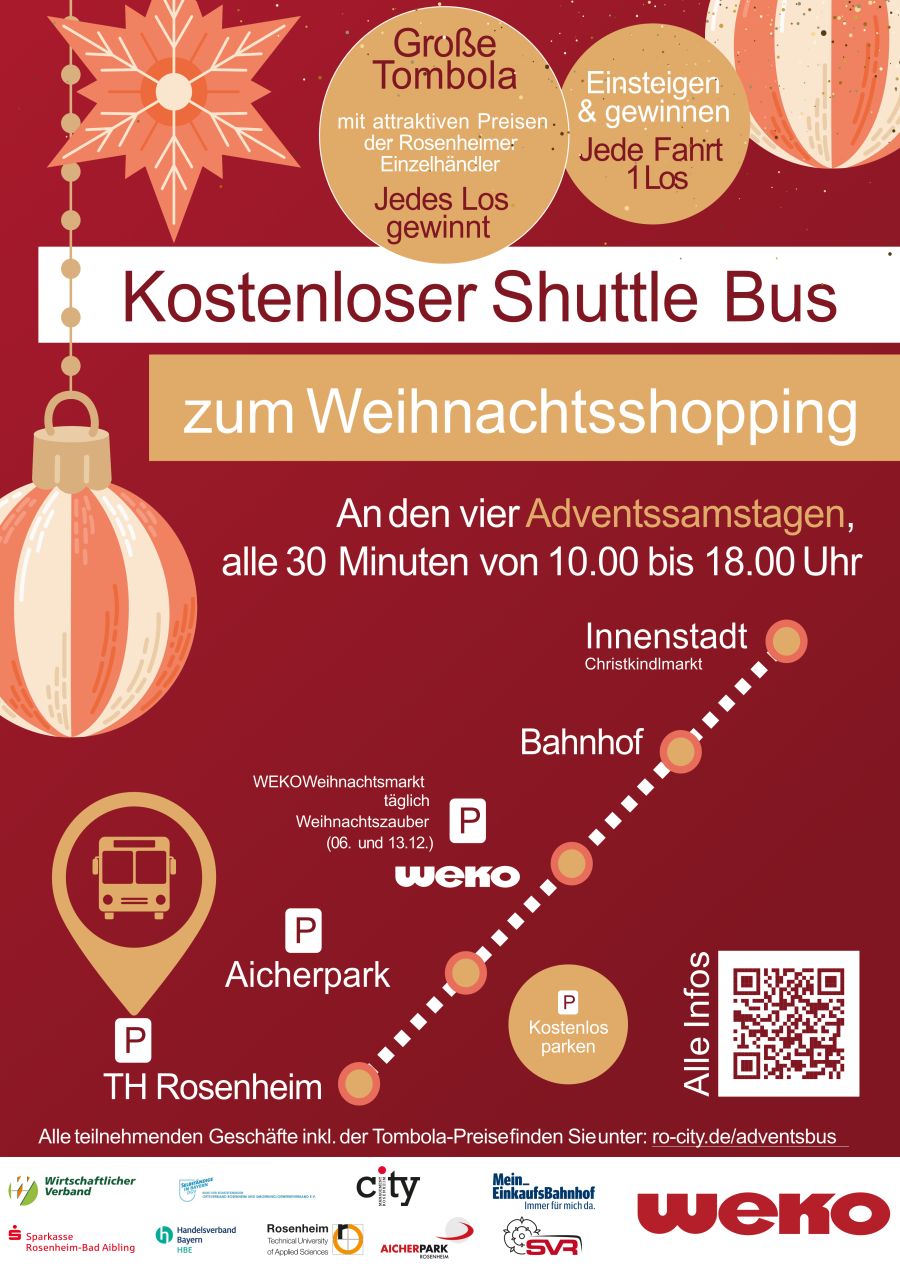 Erleben Sie den Rosenheimer Christkindlmarkt aus einer ganz besonderen Perspektive! Unsere Rundfahrten starten ab der Heilig-Geist-Straße und führen in rund zehn Minuten ohne Zwischenstopps durch die festlich geschmückte Innenstadt. Die Strecke verläuft an allen drei Haupteingängen des Marktes vorbei und bietet einen einzigartigen Blick auf das Marktgeschehen – ein Angebot, das es in dieser Form nur zum Rosenheimer Christkindlmarkt gibt.